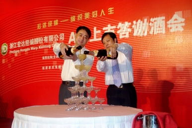 嘉興市人大常委會副主任(時任中共海寧市委書記沈利農)在“宏達經編”新股上市儀式上