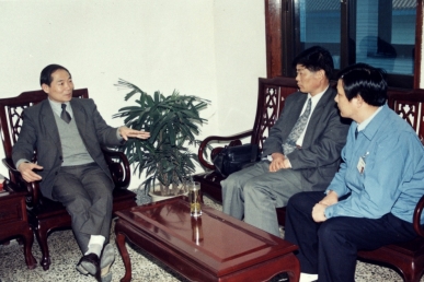 海寧市人大常委會主任(時任中共海寧市常務副市長)徐輝陪同前往考察的香港實業家查濟民先生在宏達經編實業公司