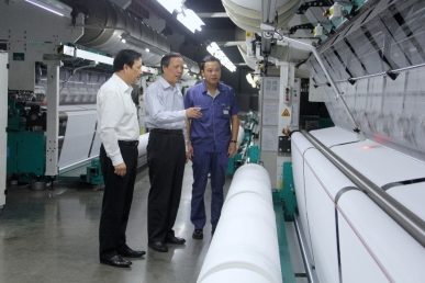 時任海寧市市長應忠良(左)在浙江宏達經編實業公司車間