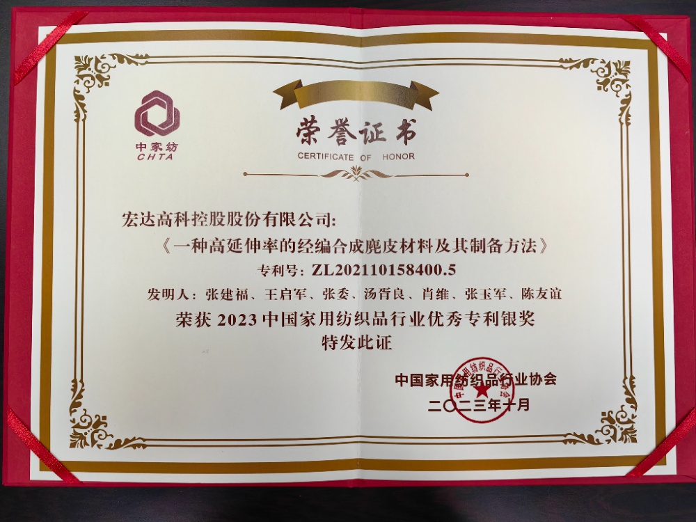 為激發(fā)行業(yè)創(chuàng)新活力,挖掘行業(yè)創(chuàng)新潛能,2023年10月,中國家用紡織品行業(yè)協(xié)會相繼開展了2023年家紡行業(yè)優(yōu)秀“科技+家紡”論文(案例)征集活動、2023年中國家紡行業(yè)優(yōu)秀專利征集活動,經(jīng)評選,宏達高科控股股份有限公司提交的《一種高延伸率的經(jīng)編合成麂皮材料及其制備方法》專利榮獲“2023中國家用紡織品行業(yè)優(yōu)秀專利銀獎”。