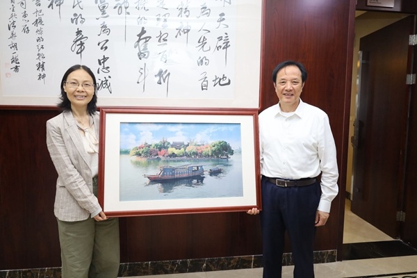 在沈國甫董事長的陪同下,徐穎云書記一行參觀了公司的展廳。沈事長向大家介紹了公司的發(fā)展歷程、產(chǎn)業(yè)結(jié)構(gòu)和黨建情況。沈董事長表示,作為經(jīng)濟管理學(xué)院1990級企業(yè)管理校友,自己與母校情誼深厚,離開學(xué)校之后和母校有許多的項目合作,并希望能夠與母校建立起更多的聯(lián)系與合作,共同推動校企雙方的高質(zhì)量發(fā)展。
