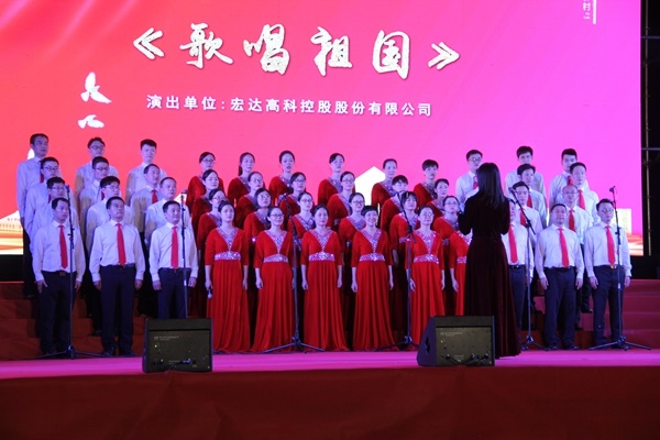 宏達高科合唱隊演唱的曲目是《歌唱祖國》。伴隨著雄壯的背景音樂,一曲《歌唱祖國》劃破了夜空。“五星紅旗迎風飄揚,勝利歌聲多么響亮……”。合唱團成員的歌聲隨著指揮王英老師舞動的雙手,時疾時徐、時高時低,表達著中華兒女歌頌偉大祖國的豪邁氣概。經過激烈的比拼,宏達高科合唱隊最終獲得三等獎的好成績。