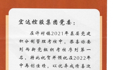 宏達控股集團黨委在許村鎮2021年基層黨建積分制管理考核中,委列兩新黨組..
